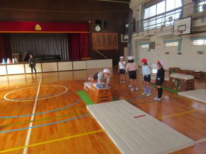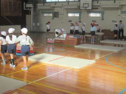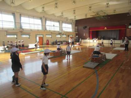 体育科「跳び箱を使った運動遊び」の様子です。2年生が跳んだり、乗ったり、跳び越えたり……友達と見合いながら楽しく運動していました。