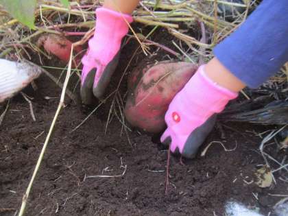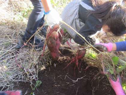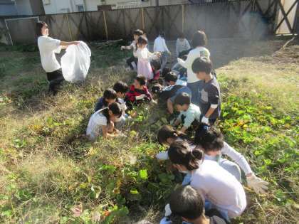 正門前の学校農園で、1年生が育てていたサツマイモの芋ほりをしました。強くて長いつるをたどりながら一生懸命土を掘っていくと、大きなサツマイモが出てきました。