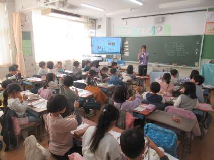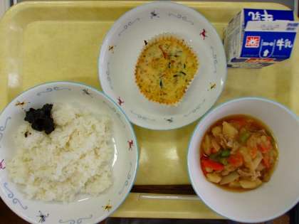 今日の給食 ・牛乳 ・ごはん ・海苔の佃煮 ・豆腐入り卵焼き ・肉じゃが 「海苔の佃煮」は、給食室の大きな釜で調理しました。細かくしたのりを、砂糖、しょうゆ、酒、みりん、水といっしょに、ゆっくり煮込んで作ります。ごはんによく合う味付けです。 「豆腐入り卵焼き」は、細かくした豆腐を、卵焼きの中に入れて作りました。豆腐の他に、豚ひき肉、にんじん、ひじき、干ししいたけ、ねぎが入っています。 音楽(1年)