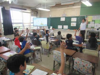 9月の土曜授業日です。学校公開を行いました。写真には写っていませんが、教室の後ろや横で多くの保護者の方々が参観してくださいました。子供たちはよく集中して学んでいました。[写真は道徳で話し合う3年生、総合的な学習の時間にパラリンピックについて学んでいる4年生、国語で新聞記事を読む5年生様子です] ![]() ![]() ![]() ![]() ![]() ![]() 9月12日(金)![]() ![]() 今日の給食 ・牛乳 ・豆わかごはん ・さばの塩麴焼き ・じゃがいものみそ汁 ・切り干し大根の煮物 9月15日の「敬老の日」にちなんで、今日は「まごわやさしい」献立です。「まごわやさしい」は、栄養バランスの取れた食生活に役立つ食材の頭文字を組み合わせたものです。 ま→「まめ」、ご→「ごま」、わ→「わかめ」、や→「やさい」、さ→「さかな」、し→「しいたけ」、い→「いも」 食べながら、給食に入っている「まごわやさしい」を見つけてみてください。 音楽(1年)