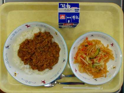 校内研究会を行いました。2年生のゲーム(鬼遊び)の提案授業のある研究会です。授業は、学習のめてと流れの確認、準備運動、チームごとの作戦確認、整列、挨拶、握手、円陣を組んで声出しと続きました。体育館いっぱいに子供たちの元気な声が響いています。このゲームを楽しみにしていることが、子供たちの姿から伝わってきます。いよいよゲーム(鬼遊び)「トレジャーハンター〜お宝ゲットだぜ〜」が始まります。 ![]() ![]() ![]() ![]() ![]() ![]() 9月17日(水)![]() ![]() 今日の給食 ・牛乳 ・ごぼう入りドライカレー ・パリパリサラダ 「ごぼう入りドライカレー」には、細かく刻んだごぼうが入っています。カレーと一緒に煮込むと、ごぼうが苦手な人にも食べやすい味になります。 「パリパリサラダ」には、細く切って油で揚げたしゅうまいの皮を入れました。野菜とよく合うので、いっしょに食べると、サラダがよりおいしくなります。パリパリとした食感を楽しみましょう。 算数(1年)