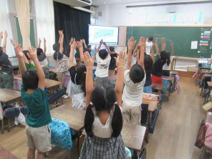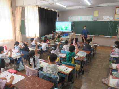 1〜3年、4〜6年の二つに分けて時間をずらし、全学年の保護者会を行いました。運動会の方針についての説明の後、子供たちの様子や今後の予定についてお伝えしました。また、夏休みの様子などについて保護者の方々が情報交換をする学級もありました。5年生は7月に実施した岩井移動教室の写真をもとに子供たちの成長を確認する時間もありました。全学級で来年度のPTA役員候補についての話合いもありました。参加してくださった保護者の皆様、PTAの担当の方々、ありがとうございました。 ![]() ![]() ![]() ![]() ![]() ![]() 9月9日(火)![]() ![]() 今日の給食 ・牛乳 ・中華おこわ ・菊花シューマイ ・わかめスープ 9月9日は「重陽の節句」の日です。「菊の節句」とも言われ、菊の花をかざったり、お酒に菊の花を浮かべて飲んだりして、長生きを願います。 今日はそれに合わせて、菊にちなんだ「菊花シューマイ」を出しました。 シューマイを菊の花に見立て、給食室で一つ一つ手づくりしました。形を楽しみながら食べてください。 9月8日(月)![]() ![]() 今日の給食 ・牛乳 ・枝豆とコーンのごはん ・ししゃものカレー揚げ ・肉じゃが ごはんに入っている枝豆とコーンは、暑い時期に旬をむかえる夏野菜です。夏野菜はあざやかな色をしているものが多く、栄養もたくさんふくまれています。今日は枝豆の緑色と、コーンの黄色を楽しんで食べてください。 暦の上では秋になりましたが、暑い日が続いています。毎日の食事をしっかりとって、残暑を元気にのりきりましょう。 外国語(5年)