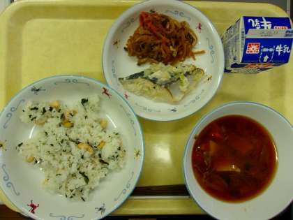 9月12日(金)![]() ![]() 今日の給食 ・牛乳 ・豆わかごはん ・さばの塩麴焼き ・じゃがいものみそ汁 ・切り干し大根の煮物 9月15日の「敬老の日」にちなんで、今日は「まごわやさしい」献立です。「まごわやさしい」は、栄養バランスの取れた食生活に役立つ食材の頭文字を組み合わせたものです。 ま→「まめ」、ご→「ごま」、わ→「わかめ」、や→「やさい」、さ→「さかな」、し→「しいたけ」、い→「いも」 食べながら、給食に入っている「まごわやさしい」を見つけてみてください。 音楽(1年)