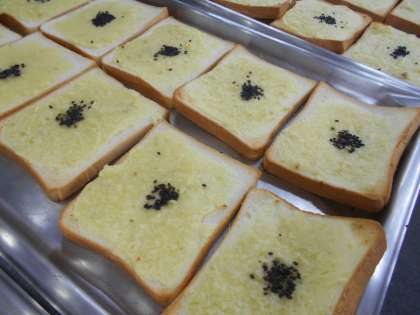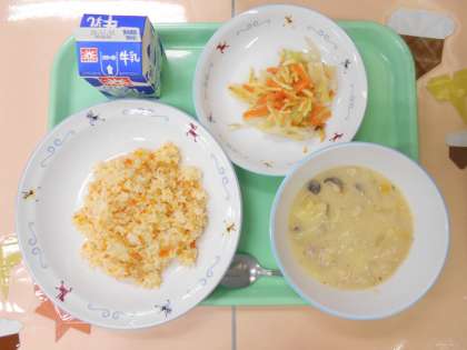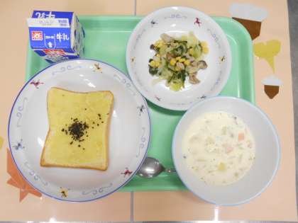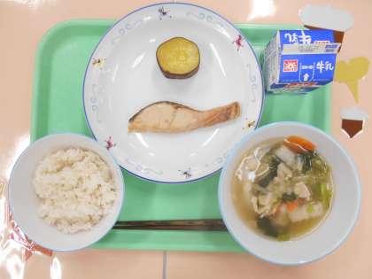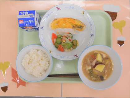 今日は秋らしいメニューでした。もみじ焼きは、にんじんのすりおろしにマヨネーズ、塩こしょうを混ぜたものをかけて焼いています。