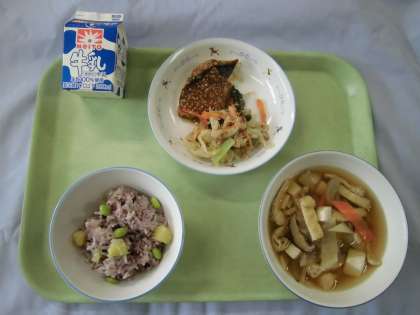 ◆ 萩ごはん ◆ さばの南部焼き ◆ キャベツのあっさり和え ◆ 具だくさんすまし汁 「さばの南部焼き」は岩手県の郷土料理です。 現在の岩手県北部と青森県東部の県境一帯は、かつて「南部(盛岡)藩」が統治しており、胡麻の名産地でした。 このことから、胡麻を用いた料理が発達し、「南部」の名がつけられるようになったと言われています。 「萩ごはん」は季節の料理です。 秋の彼岸の終わりではありますが、季節・行事の料理です。 秋の花である萩を黒米で、花弁はさつまいもで、葉は枝豆で表しました。 (写真の南部焼きは、盛り付けの際に少し崩れてしまいました。) |
