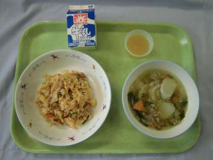 ◆ 五目チャーハン ◆ 中華風コーンスープ ◆ 柿 今日は運動会の後半戦の予定でしたが、天候不良のため延期となりました。 柿は秋の味覚の果物です。 古くは奈良時代頃から食用としていたという説もあるほど、なじみの深い果物です。 10月11日の給食