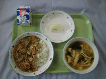 ◆ 豚丼 ◆ なめこ汁 ◆ 梨 なめこ汁は、人気のあるみそ汁です。 なめこの周りのゼリー状のものは、タンパク質や食物繊維が結合したものです。 口当たりも柔らかく、食べやすいことも人気の理由の一つなのでしょうか。 9月26日の給食