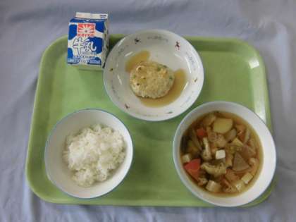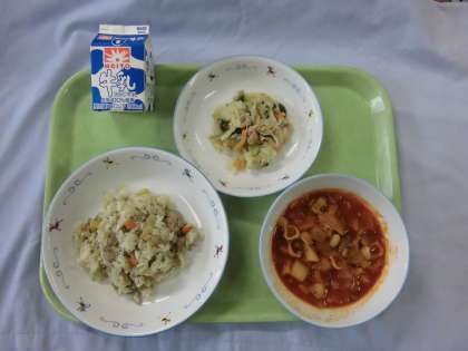 ◆ 鶏ごぼうピラフ ◆ ツナサラダ ◆ ミネストローネ ミネストローネはイタリアのスープで、「具だくさんのスープ」という意味だそうです。 今日は、トマトペーストも加えました。名前のとおり具だくさんで、「食べるスープ」のようでした。 10月6日の給食