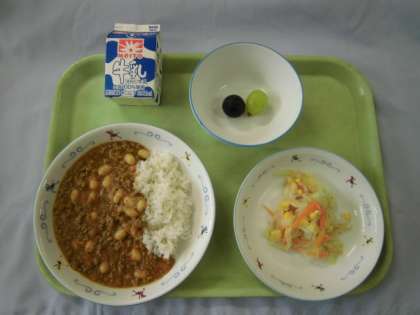 ◆ チリ・コン・カルネライス ◆ マスタードサラダ ◆ ぶどう食べ比べ(巨峰・シャインマスカット) 今日は、秋の味覚の食べ比べということで、巨峰とシャインマスカットです。 それぞれを味わうことはあっても、同時に食べ比べてみるという経験は多くないかもしれません。 色などの見ためはもちろん、味、香り、食感などもそれぞれの個性がしっかり感じられたようです。 児童はそれぞれを味わいながら、どちらが好きかなどで盛り上がっていました。 9月30日の給食