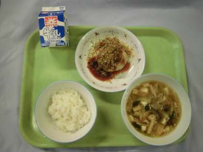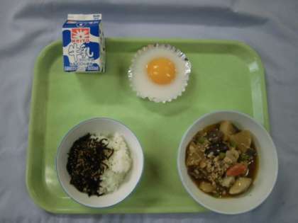 ◆ ごはん ◆ ひじきふりかけ ◆ 里芋のそぼろ煮 ◆ お菓子な目玉焼き 今日は「十五夜」です。またの呼び名は「芋名月」です。 このことにちなんだ行事食で、主菜は芋(里芋)を使ったそぼろ煮を、デザートにはカルピスゼリーの真ん中にある黄桃が満月のように見えます。 10月3日の給食