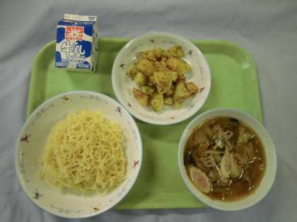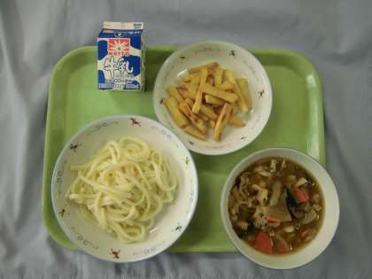 ◆ みそ煮込みうどん ◆ キャラメルポテト 児童に人気のある料理を組み合わせました。 キャラメルポテトは、カリカリに揚げたさつまいもを、ザラメと水、バターで作ったキャラメルソースに絡めたデザートです。 キャラメルソースは甘すぎないので、うどんと組合せても遜色ないようです。 朝から、「今日のメニューがとても楽しみ」という児童の声がよく聞こえてきました。 10月7日の給食