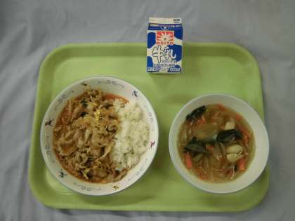 ◆ 豚キムチ丼 ◆ 春雨とチンゲンサイのスープ 運動会の練習も佳境に入っています。 児童は、給食時間ギリギリまで熱心に練習に励んでいます。 気温差も大きくなり、疲れも感じやすくなってくる頃なので、配膳や片付けが簡易で食べやすく、疲労回復にも効果のある内容にしました。 キムチのうま辛が食欲を促すようです。 10月8日の給食