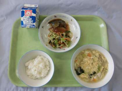 ◆ ごはん ◆ さばの塩焼きおろしだれ ◆ からし和え ◆ むらくも汁 むらくも汁は「群雲」と書きます。 気象用語の一つで、小さな塊になった雲が群れ集まっている様子を示します。 秋の空に現れる群雲を卵で表しています。 (写真のさばは、盛り付ける時に崩れてしまいました。) 10月9日の給食