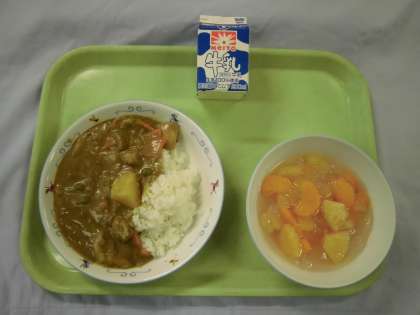 ◆ カレーライス ◆ フルーツポンチ いよいよ運動会当日です。 今日に限って肌寒く、時折雨も強く降る天候でしたが、内容を変更して半分を実施しました。 給食室では、「寒いだろうからあつあつのカレーで温まってもらおう!」と、仕上がり時間を調整して提供しました。 児童もよく食べていました。 10月10日の給食