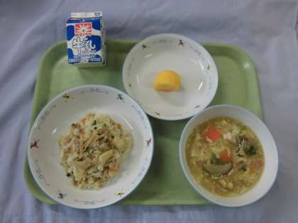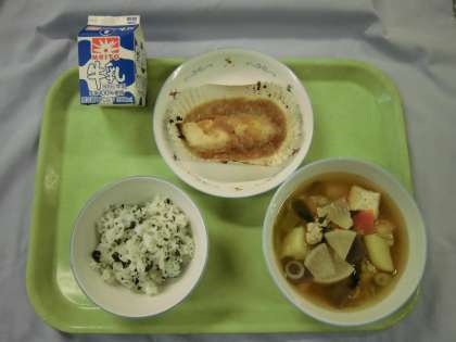 ◆ わかめごはん ◆ かますのレモンソース焼き ◆ 根菜のみそ汁 レモンソースは、レモン果汁の他にバターなどを使った本格的なソースです。 白いごはんにもよく合いますが、今日はわかめごはんを組み合わせました。 10月17日の給食