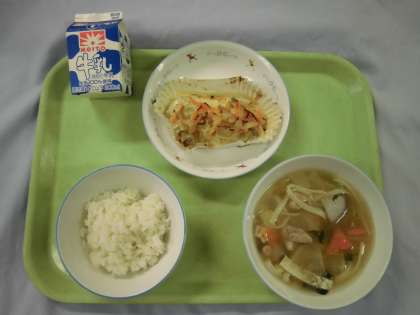 ◆ 麦ごはん ◆ 魚のみそマヨソース ◆ おくずかけ 「おくずかけ」は宮城県の郷土料理です。 具だくさんの汁にくずでとろみをつけ、茹でた乾麺を加えた料理です。 寒い時期、身体が温まります。 10月15日の給食