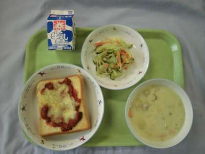 ◆ ピザトースト ◆ チキンチャウダー ◆ 和風サラダ 今日から月末まで、南町小学校では「秋の読書旬間」を実施します。 昨年度からは、給食でも「コラボメニュー」として本に出てくる料理を出しています。 今年度の第一回めは、『しょくぱんちゃん6しまい』から「ピザトースト」を選びました。 ピザトーストは、上のチーズが冷えると固くなってしまうので、実施する時期に配慮が必要です。今回は寒くなる前に実施することができました。 10月16日の給食
