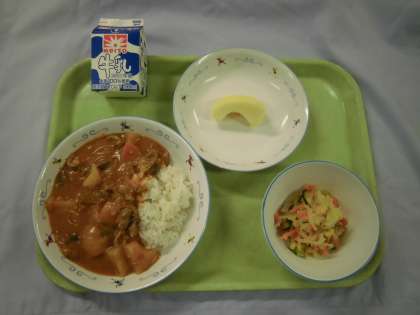 ◆ コメッコハヤシライス ◆ 和風だいこんサラダ ◆ りんご 「コメッコ」とは「米粉」を表します。 また、既製のデミグラスソースは使わず、全て給食室で手作りするので、野菜などから出る甘みなどの様子を見て味を調整ができます。 ほどよいトマトの酸味と玉ねぎなどの甘みがよく調和していました。 10月21日の給食