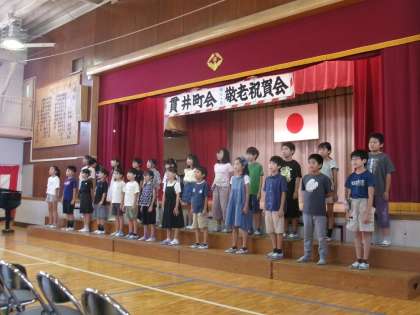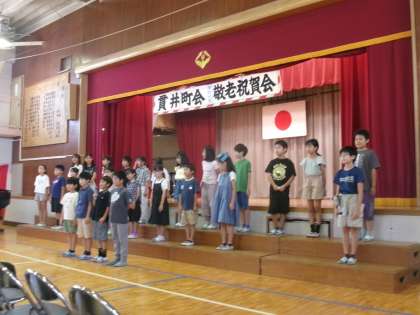 練二小の体育館にて、貫井町会の敬老祝賀会が行われました。本校から4年生有志による合唱、練馬第三小学校の合唱団のみなさんによる合唱、貫井中学校の吹奏楽部のみなさんによる演奏、貫井町会の阿波踊り「つくし連」のみなさんによる演舞と、様々な発表が行われました。