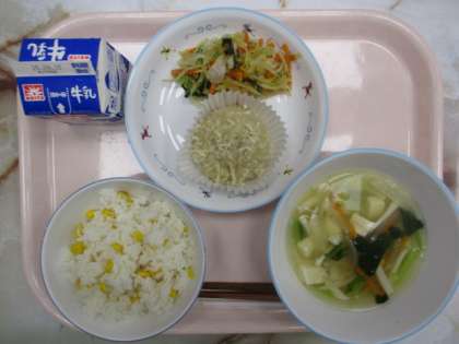 とうもろこしご飯 菊花しゅうまい 菊の花のポン酢あえ 沢煮椀