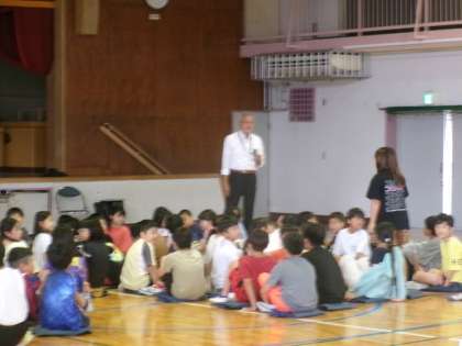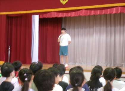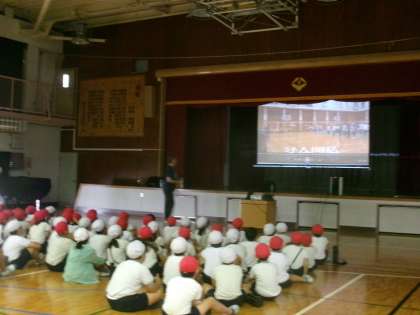 今朝は3つのお話をしました。1:土曜日の敬老祝賀会に参加してくれた4年生有志のみなさん、そして阿波踊りを披露してくれたつくし連に参加してくれた3年生に、みんなで拍手を送りましょう。2:今朝の2時半から4時くらいの間に、皆既月食という自然現象が起きていました。次に皆既月食が見られるのは来年の3月3日のひな祭りの日です。3:1年2組のみなさんに、2学期の避難訓練で折り畳み式の防災ヘルメットを使ってもらって、感想を教えてもらいたいと思っています。是非協力をしてください。