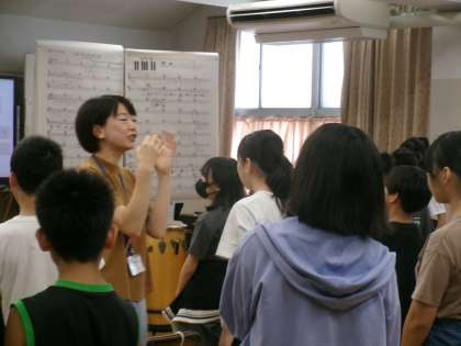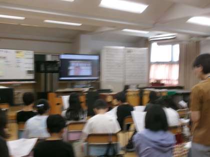 授業の始まりはボディパーカッションでした。いくつの音パートを聞き取れたか確認して、動画と一緒にリズムを刻みました。「ひまわりの約束」では、響きのある歌声をだすために、先生の歌声を真似て少しずつ高音に挑戦していきました。とても綺麗な高音を出すために、体のどの部分に意識を向けるのか発表して、取り組んでいます。