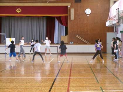 体育館で5年生の運動会委員の子たちが、ソーラン節の振り付けを練習していました。学年全体での練習でお手本役も務める委員のみんな、確認するように踊っていました。