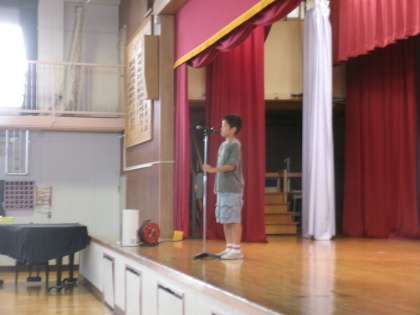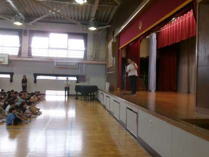 一言にバリアフリーといってもイメージしにくいのですが、「いろいろな人にとって暮らしやすい町」とわかりやすくお話をしてくださいました。手話教室や、貫井福祉園との交流など、教科書だけでは学べない学びをたくさん重ねている4年生です。 ![]() ![]() 9/29 全校朝会