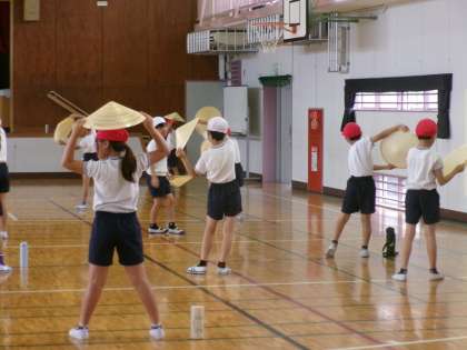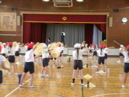 4年生は一人ひとり「パーランクー」をもって体育館に移動しました。沖縄の民舞で使用される打楽器ですね。左手にもつ太鼓と、右手にもつバチを動かし、ステップを踏む動きを確認しつつ、振り付けを覚えています。