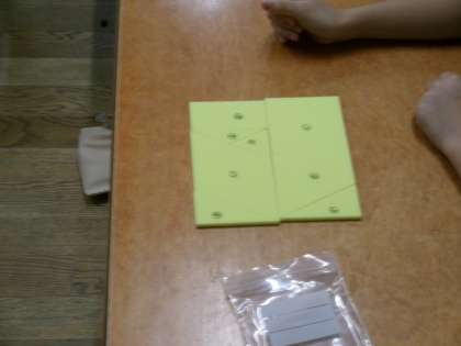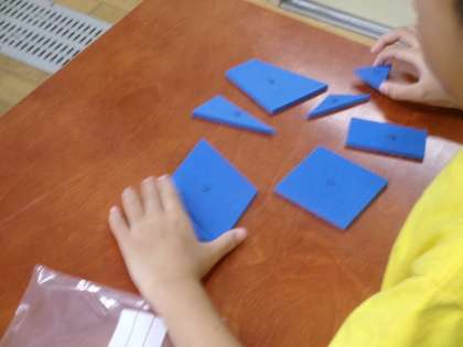 タングラムとも言いますね。いくつかに切り分けられたパズルを組み合わせて、目標になる形を作っていきます。裏返してならべるなど、工夫して取組んでいます。