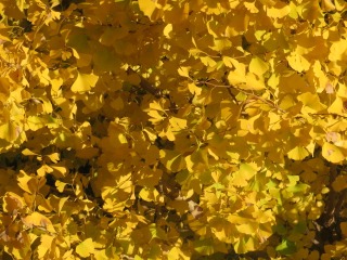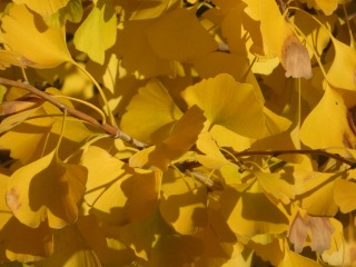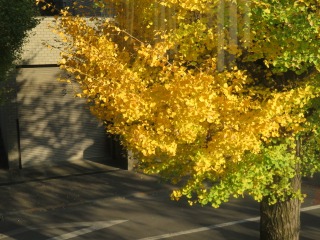 温暖化の影響でしょうか。イチョウの黄葉は輝きの金色になり、師走まで伸びます。 11月5日記事の紅も参照ください。 |