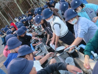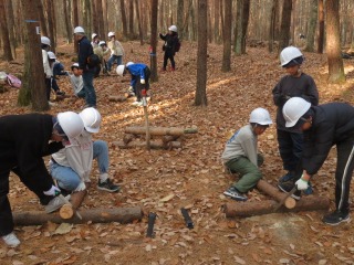 林業体験・ベルデの森に関して。 「これぞ森、これぞ山という感じでした。自然いっぱい、おいしい空気だからです。」 「木を切って、重い感じがしました。木自体が重い感じでした。」 「木がたくさんで、ちょっと行っただけで、ベルデが見えなくなりました。落ち葉がカサカサ言って、とげとげの葉もありました。」 「枯れ木や小さい木、大きい木などいろいろでした。木工作はみんな違って、個性的でした。冬ならではの軽井沢でした。」 5年軽井沢移動教室(1)