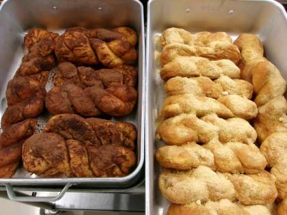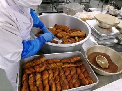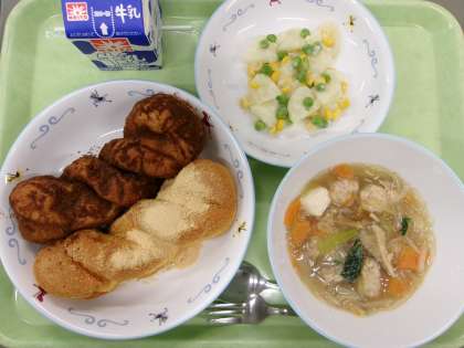 セレクト揚げパン ピーコンポテト 鶏団子スープ 今日は「セレクト揚げパン」給食です。事前にきなこ味とココア味のどちらを食べたいか調査し、自分で選んだ方の揚げパンを食べます。サクッふわっの揚げパンを楽しんで食べました。 今日の給食 11/19(水)