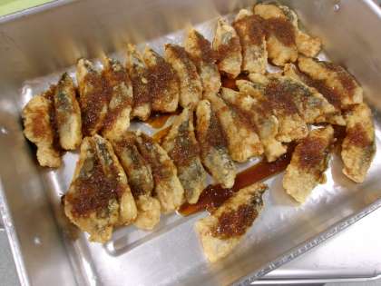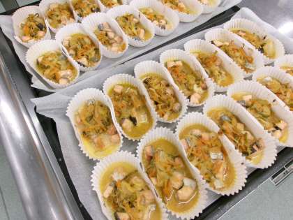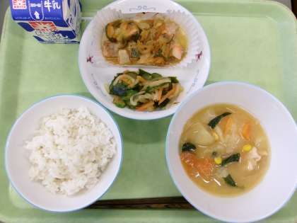麦ごはん 白身魚の変わりソース 野菜の海苔和え キャベツのみそ汁 今日の魚は「タラ」を使いました。タラは柔らかくてクセがなく食べやすいので、煮ても焼いても揚げてもおいしく、様々な料理に合う魚です。冬が旬の魚で、鍋物の具材としてよく使われています。今日は油でカラッと揚げてから、玉ねぎを入れて作ったソースをかけました。みそ汁には、五十嵐農園から届いたキャベツをたっぷり入れました。 今日の献立 11/26(水)