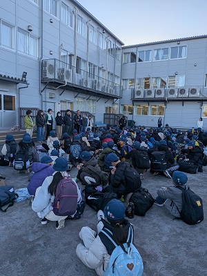麦ごはん 鮭のチャンチャン焼き 大根サラダ どさんこ汁 今日は北海道の郷土料理を作りました。「鮭のチャンチャン焼き」は、角切りの鮭と炒めた野菜をのせてオーブンで焼きました。「どさんこ汁」は、北海道でよくとれる食材のじゃがいもや玉ねぎ、にんじん、とうもろこしと、仕上げにバターを入れて作りました。みそ味の料理は体を温めてくれます。おいしくいただきました。 武石移動教室 帰校式