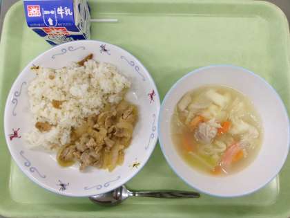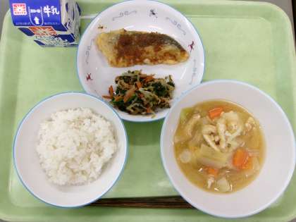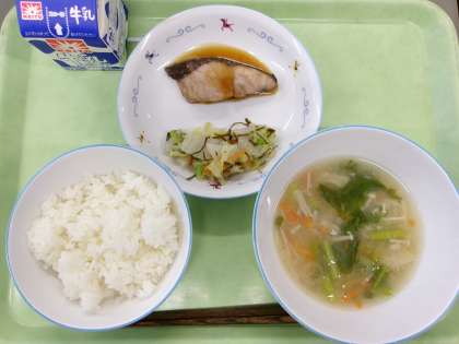 ごはん ぶりの照り焼き 白菜の浅漬け すずな汁 今日から12月です。だんだんと寒さが増してきました。今日は冬が旬のぶりを使って「ぶりの照り焼き」の献立です。五十嵐農園からは白菜が届きました。浅漬けにして、おいしくいただきました。旬のものを食べると免疫力がつきます。風邪に負けない強い体を作りましょう。 今日の給食 11/20(木)
