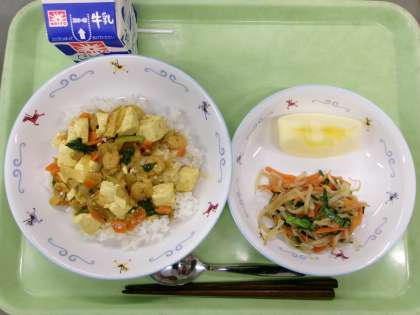 豆腐のカレー煮丼 もやしとにらの炒めもの りんご 「豆腐のカレー煮丼」は、カレー味の中華丼です。しょうがとにんにくで香りよく炒めて作りました。具は、豚肉、玉ねぎ、にんじん、たけのこ、えび、小松菜、そして豆腐が入っています。たくさんの食材から出るうま味を味わいました。どのクラスもよく食べていました。 今日の給食 11/25(火)