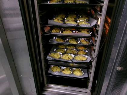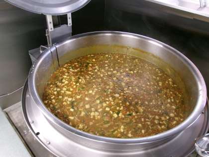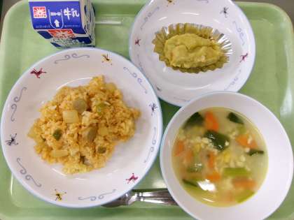 スパイシーピラフ イタリアンスープ スイートポテト 今日は洋食の献立です。「イタリアンスープ」はイタリア風の卵スープです。スープに浮いている卵は、粉チーズとパン粉と卵を混ぜ合わせて作りました。今日は、スープの小松菜とスイートポテトのさつまいもが、五十嵐農園の野菜です。34kgのさつまいもを使って、大人気のスイートポテトを作りました。学校中に甘いいい香りがただよっていました。 今日の給食 12/1(月)