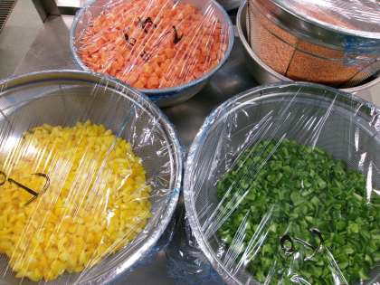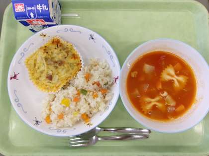 カラフルピラフ スペイン風オムレツ リボンマカロニのトマトスープ 「カラフルピラフ」は名前の通り、色とりどりの野菜を使って、彩り豊かにカラフルに仕上げました。にんじん、黄ピーマン、ピーマンが入っています。料理は目でも楽しんで食べると、よりおいしく感じられます。トマトスープには、リボンの形をしたマカロニを入れました。スープも楽しんで食べました。 今日の献立 11/27(木)
