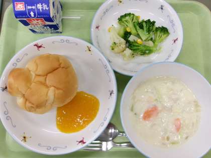 ミルクパン 手作りみかんジャム 白菜のクリーム煮 花野菜サラダ 今日も五十嵐農園の旬のとれたて野菜をたっぷり使いました。「白菜のクリーム煮」の白菜と「花野菜サラダ」のブロッコリーとカリフラワーは五十嵐農園から届きました。花野菜はビタミンCが豊富で、美肌効果や免疫力の向上など冬に嬉しい栄養がつまっています。噛み応えのあるサラダでしたが、どのクラスもよく食べていました。 今日の給食 12/2(火)