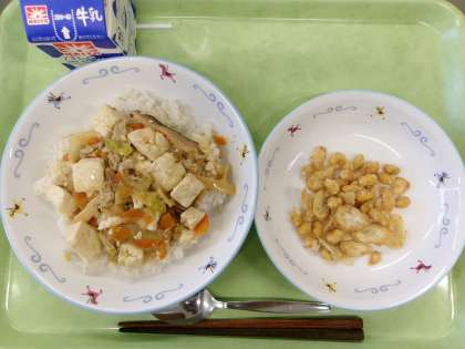 豆腐の中華煮丼 豆入りごぼうチップス 今日は中華の献立です。「豆入りごぼうチップス」は、ななめにスライスしたごぼうと大豆に片栗粉をつけて油で揚げてから塩をまぶしました。カリカリ食感のごぼうと大豆に仕上がり、残菜はほぼゼロでした。 今日の給食 12/3(水)