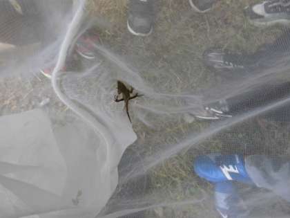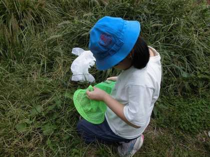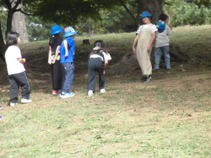 秋探しの次は、虫探しです。日頃から南校庭で虫を採っていますが、さすが光が丘公園、あっちにもこっちにもたくさんの虫がいます。せっかく採れた虫も虫かごに入れるのに苦労しています。カナヘビを見つけた子がいます。大きなトノサマバッタを見つけた子もいます。