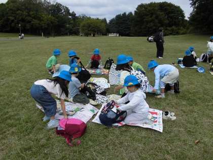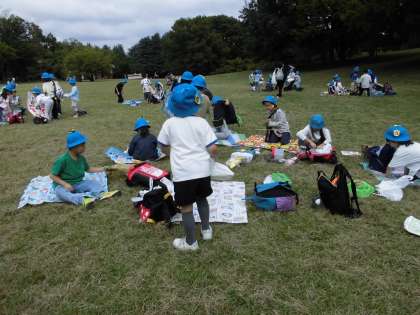 お弁当の後は芝生で遊びます。学校の芝生よりもずっと広いところで、思い切り走ったり、班ごとに、だるまさんがころんだをしたりしています。2年生が1年生に声をかけながら楽しく遊んでいる姿に、頼もしさが感じられました。
