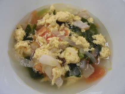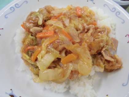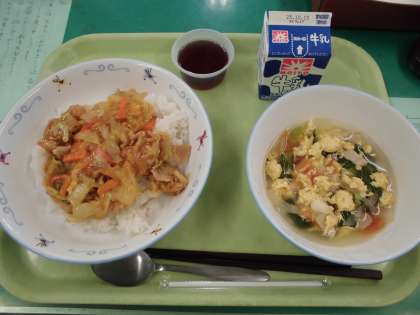 今日のメニューは、豚キムチ丼・トマトと卵のスープ・ぶどうゼリー・牛乳でした。今日は食欲を刺激する豚キムチ丼でした。キムチといっても、辛みが前面に出るのではなく、旨味が強い味わいでした。豚肉と炒めることで、さらにコクが出て、ごはんにもぴったりです。スープは、トマトがいい仕事をしていましたね。ほのかな酸味としっかりした甘みが、卵とスープにとけ込んでいました。ぶどうゼリーは文句なしのおいしさです。口いっぱいにぶどうの甘さが広がりました。