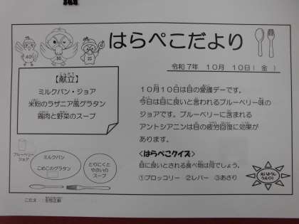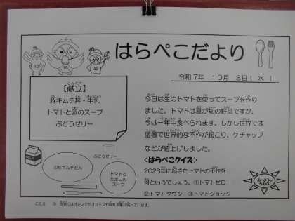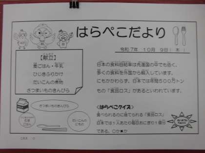 昨日、外部への出張で給食を食べられなかったので、はらぺこだよりだけ掲載します。久しぶりに平日にお昼を外食して感じたのは、物価の高騰と、給食の栄養バランスのすごさでした。子供たちの給食は無償化になりましたが、高学年で1食342円で作っています。これだけ物価が高騰している中で、その値段で栄養バランスを整えて作るなど、どれだけの努力で成り立っているのか、頭が下がります。これからも、感謝の気持ちをもって食べていきましょう。