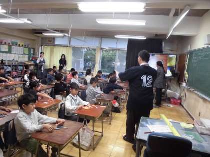 2時間目の始まりは避難訓練でした。緊急地震速報からの避難想定でした。雨天のため教室内での安全確認となりましたが、どの学級も落ち着いて対応できていました。報告終了後に、校長先生から、本日の防災訓練でご協力いただく避難拠点の皆様・区防災課の皆様・貫井出張所の皆様を紹介していただき、それぞれご挨拶をいただきました。このあと、総合防災訓練が行われました。