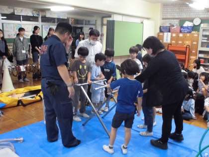 避難訓練終了後、各学年で総合防災訓練が行われました。学年の実態に合わせて、様々な活動を行いました。その様子を写真でお伝えします。災害時に使用する様々な道具を見て、子供たちも驚いたり感心したりと、いろいろと学びがありました。