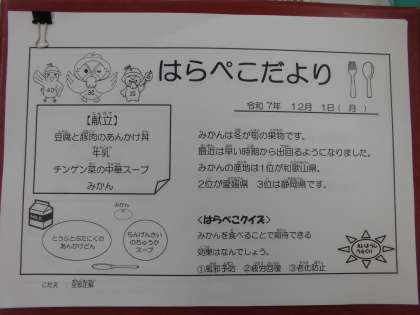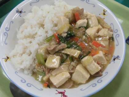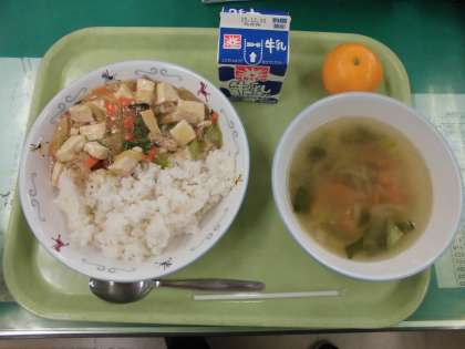 今日のメニューは、豆腐と豚肉のあんかけ丼・チンゲン菜の中華スープ・みかん・牛乳でした。丼ものは、豆腐が入ることでボリューム感もアップ。具材を餡でまとめることで一体感も出て、様々なおいしさが一度に味わえました。スープは、チンゲン菜のシャキシャキ感もよかったです。あんかけ丼に中華スープが合いましたね。そして、みかん。ちょっと甘酸っぱい味わいが食後にぴったり。果汁たっぷりでおいしかったです。