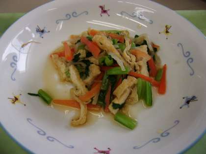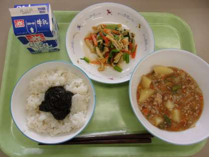 今日のメニューは、麦ごはん・のりの佃煮・じゃがいものそぼろ煮・油揚げと野菜のおひたし・牛乳でした。じゃがいものそぼろ煮は人参や干ししいたけは細かく刻み、お肉と混ぜることで苦手な人も食べやすかったと思います。油揚げと野菜のおひたしは油揚げがたっぷり入っていることでボリュームがありました。