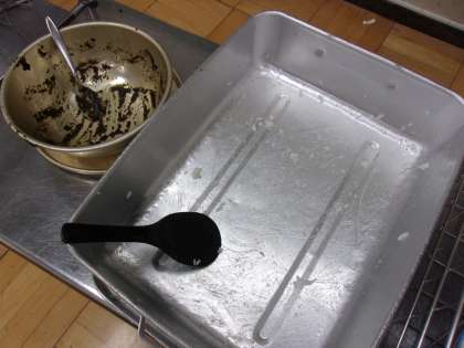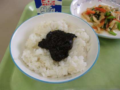 給食ではのりの佃煮も手作りです。もみのりを水でふやかしてから酒、砂糖、みりん、しょうゆを加えてぐつぐつと煮込みます。ちょうどよいかたさに仕上げるのがプロの技です。手作りの佃煮は市販のものよりずっと塩分が控えめでやさしい味です。普段残りがちの麦ごはんも今日は空っぽでした。
